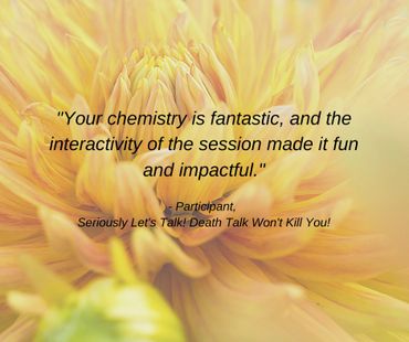 "Death Doulas Network of BC webinars are informative without being overwhelming, encourage meaningful participation, and are serious while including humour. Well rounded all the way around!!"