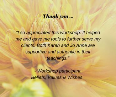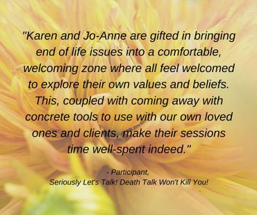 "I have grown so much in understanding my role as a Death Doula since joining, Karen Hendrickson and Jo-Ann Haun at DDNBC. Their outstanding level of knowledge of Death Doula work, plus their ability to make you feel safe and comfortable is beyond what I was expecting. I always leave the workshops feeling full, excited to be on this journey, and grateful to have this venue to learn. Thank you," - Elaine Tess - Goodbyes Matter